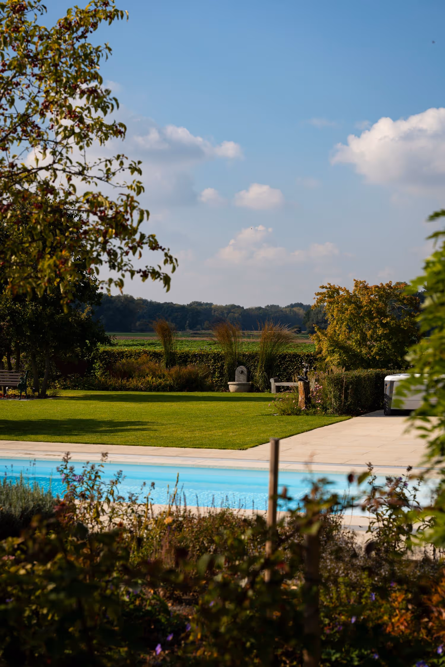 Großzügige Rasenflächen und ein klarer Sichtbezug in die offene Landschaft schaffen ein außergewöhnliches Weite-Gefühl.