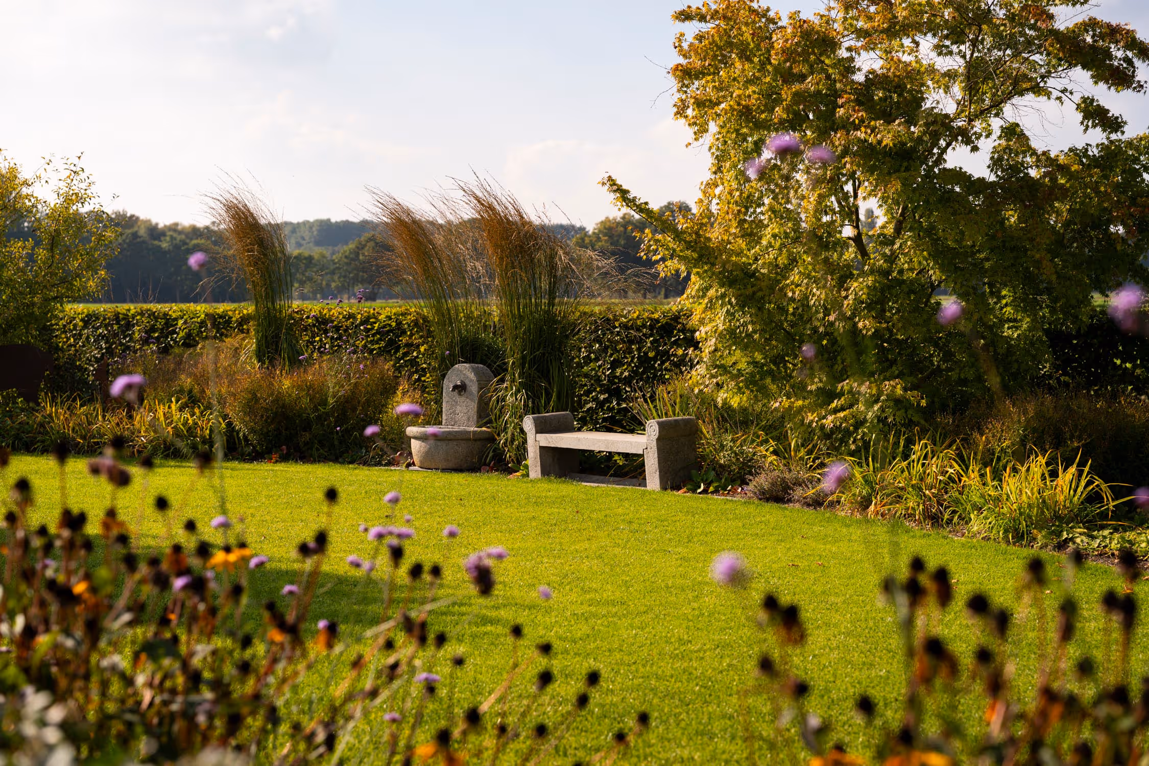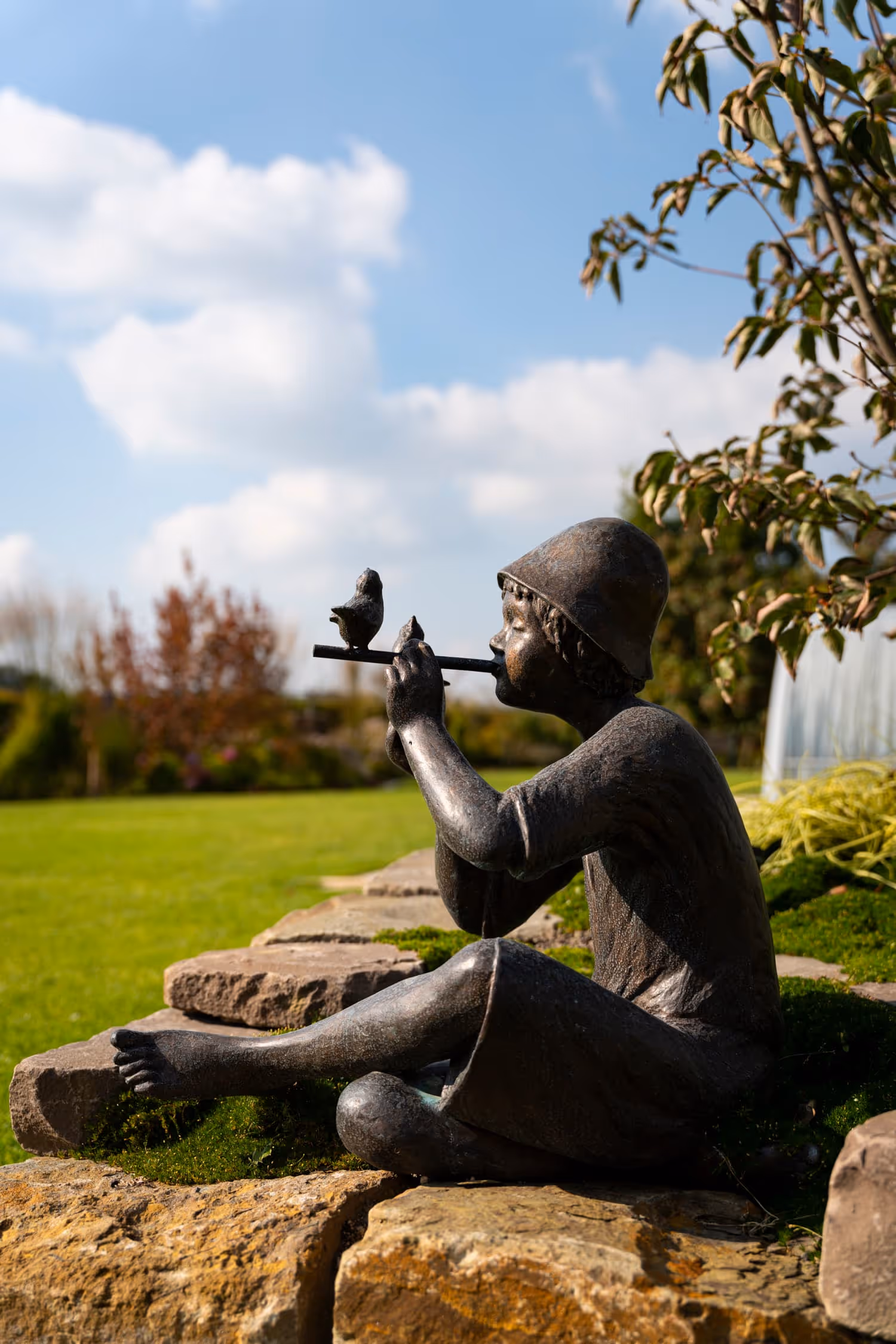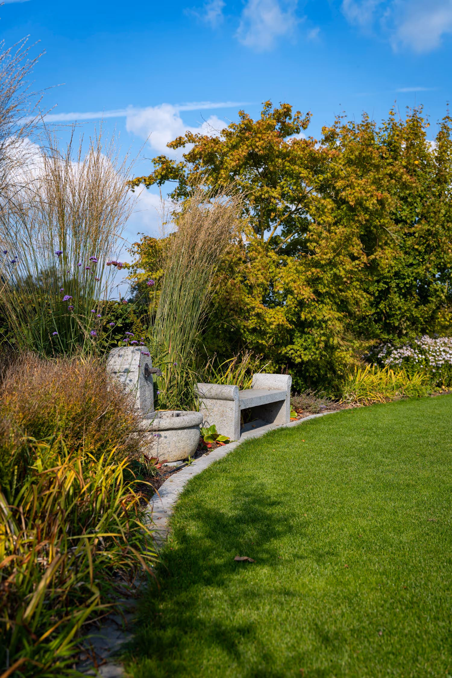 Kunstobjekte, Bänke und Wasserstellen schaffen Orte für Entspannung, Begegnung und Genuss im eigenen Grün.