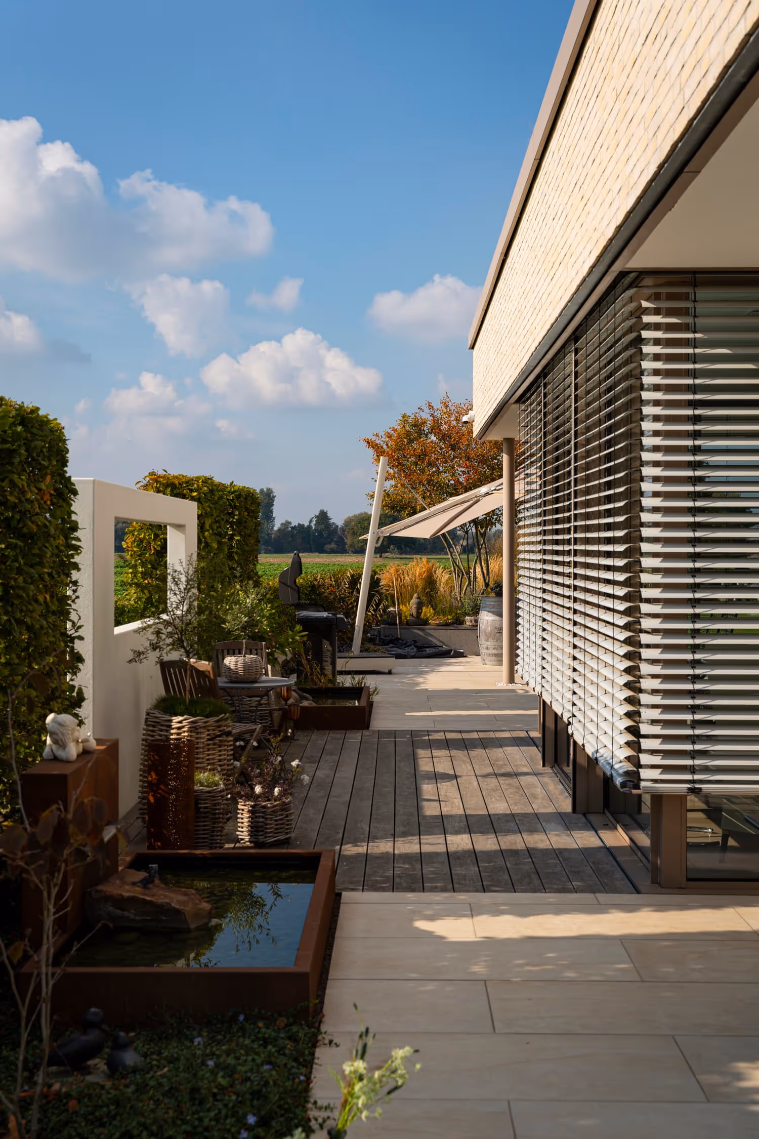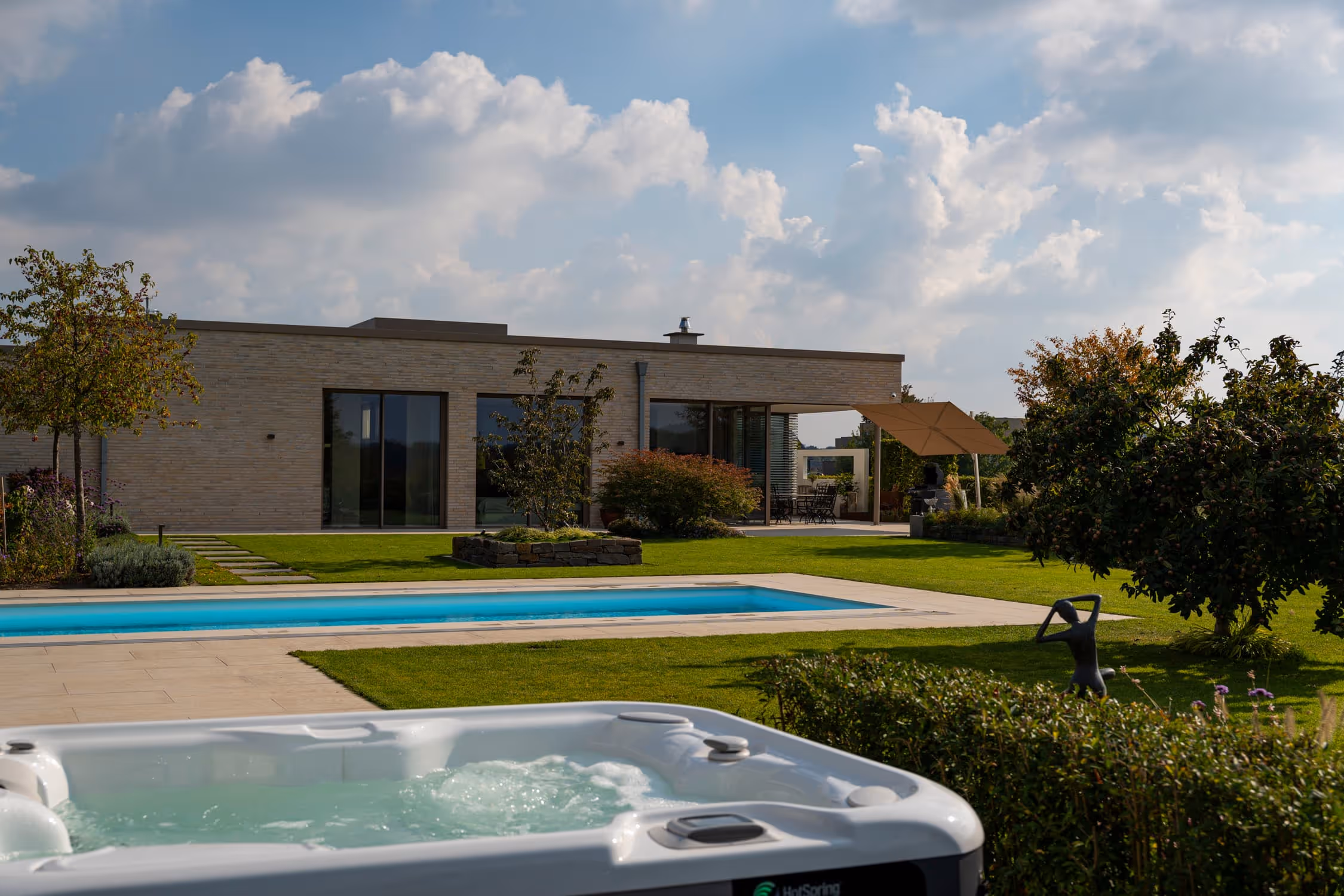 Hochwertige Terrassenmaterialien, Sicht- und Sonnenschutz sowie ein Whirlpool von Hotspring öffnen den Wohnraum elegant nach draußen.