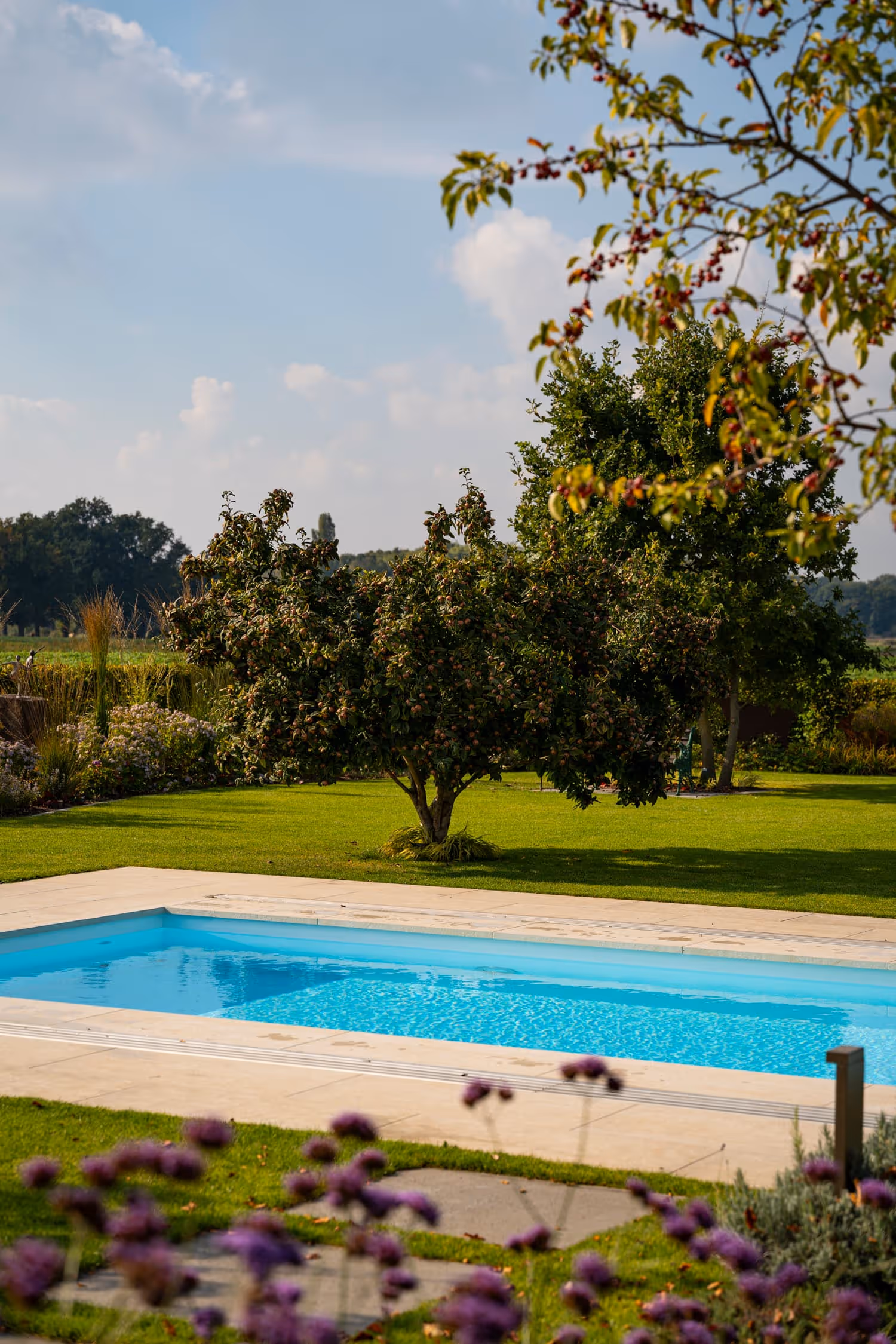 Ein moderner, geradliniger Pool wird zur architektonischen Achse zwischen Haus, Terrasse und Garten.