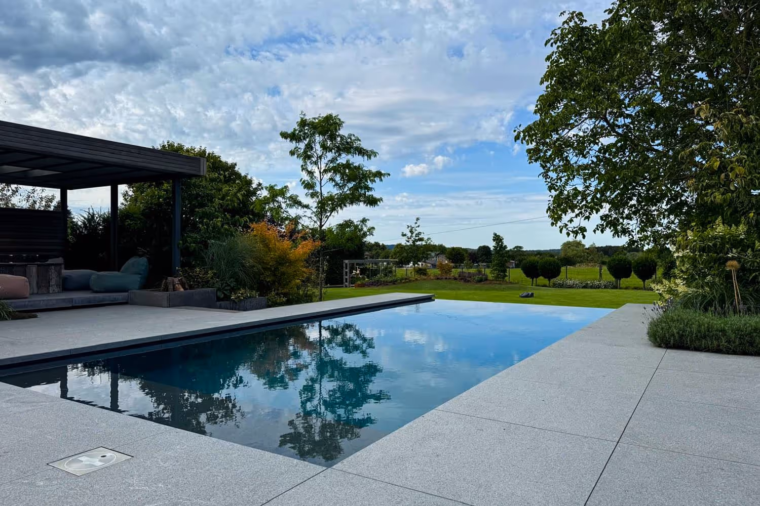 Moderner Überlaufpool mit Weitblick in die Landschaft
