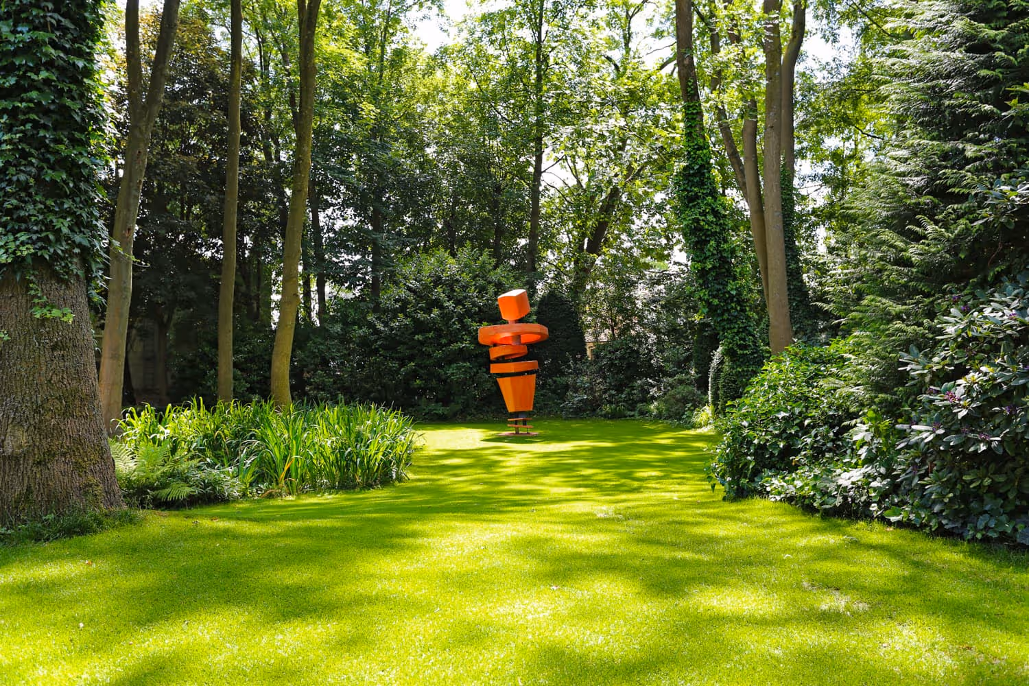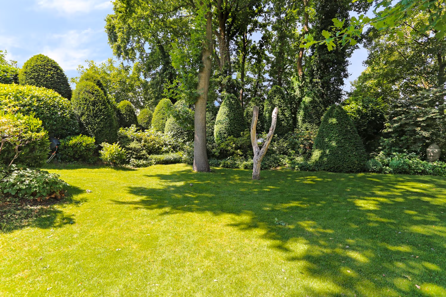 Weitläufige Rasenflächen und skulpturale Bäume