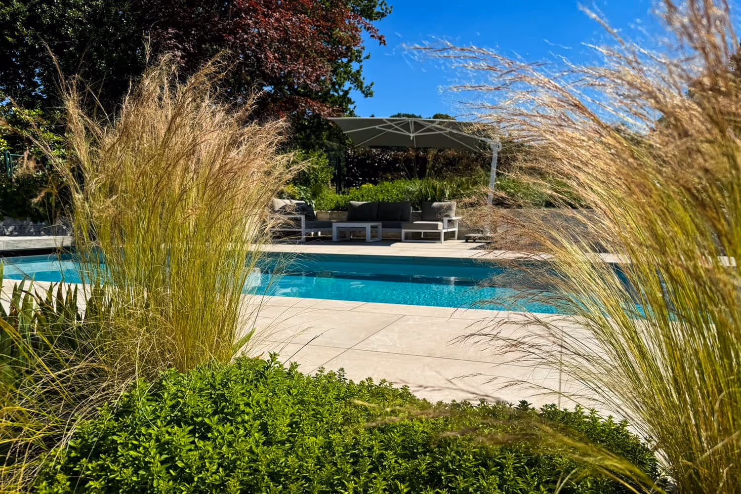 Moderner Poolbereich mit hochwertiger Natursteinumrandung