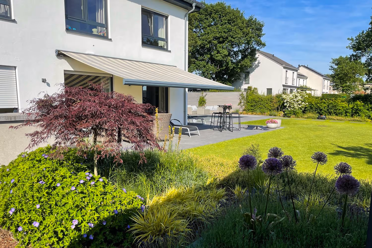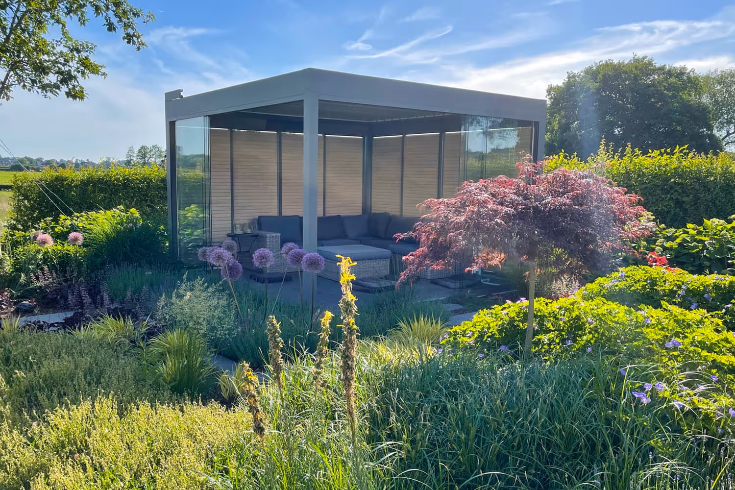 Stilvolles Außenwohnzimmer mit umliegender Staudenpflanzung