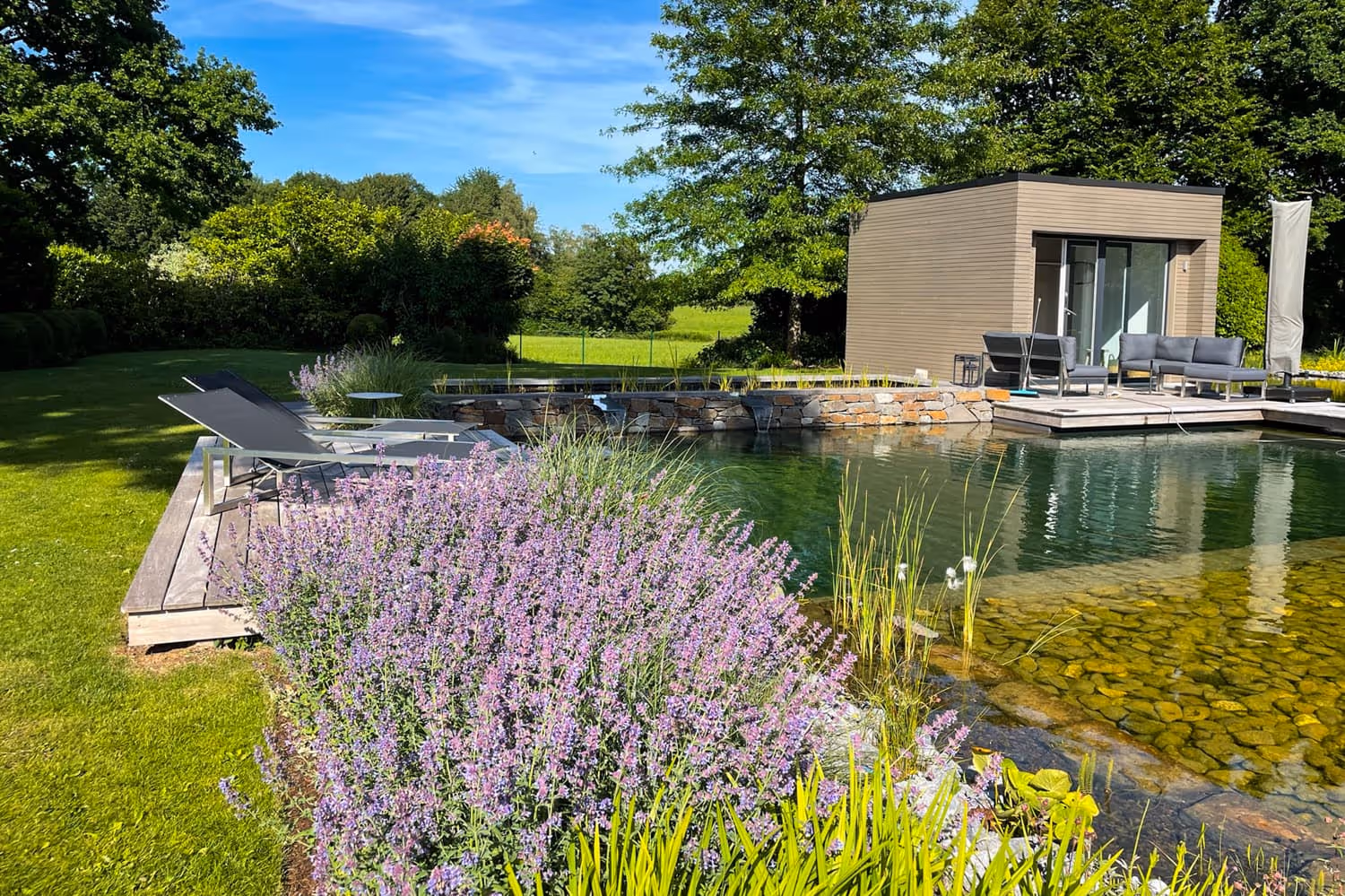 Schwimmteich mit Holzdeck und Natursteinrändern