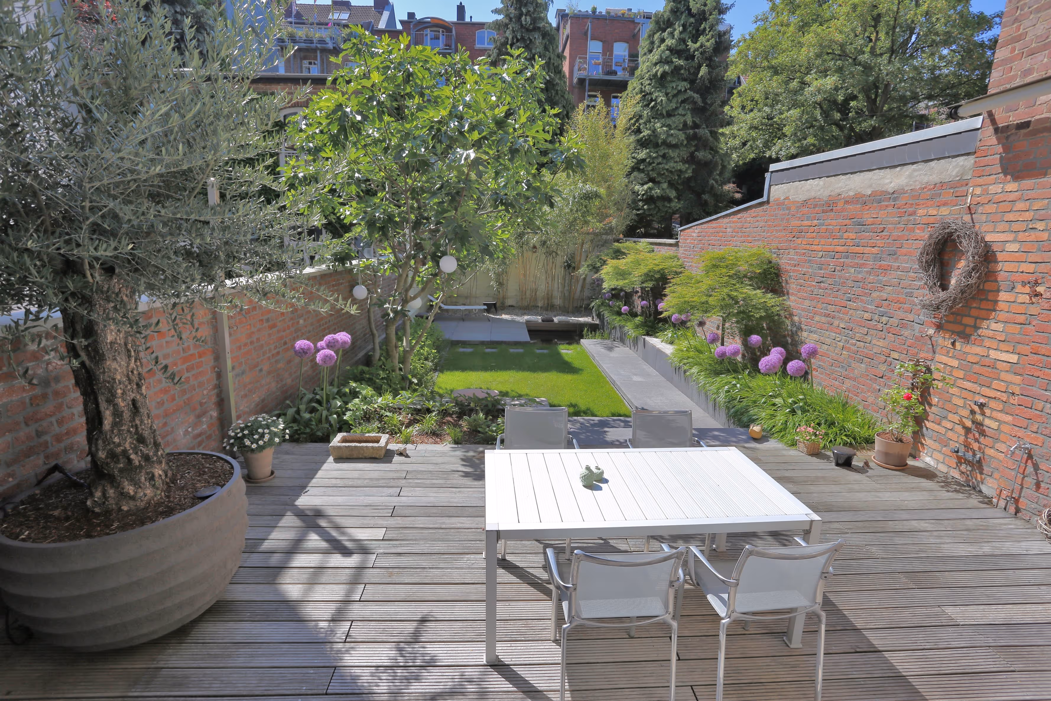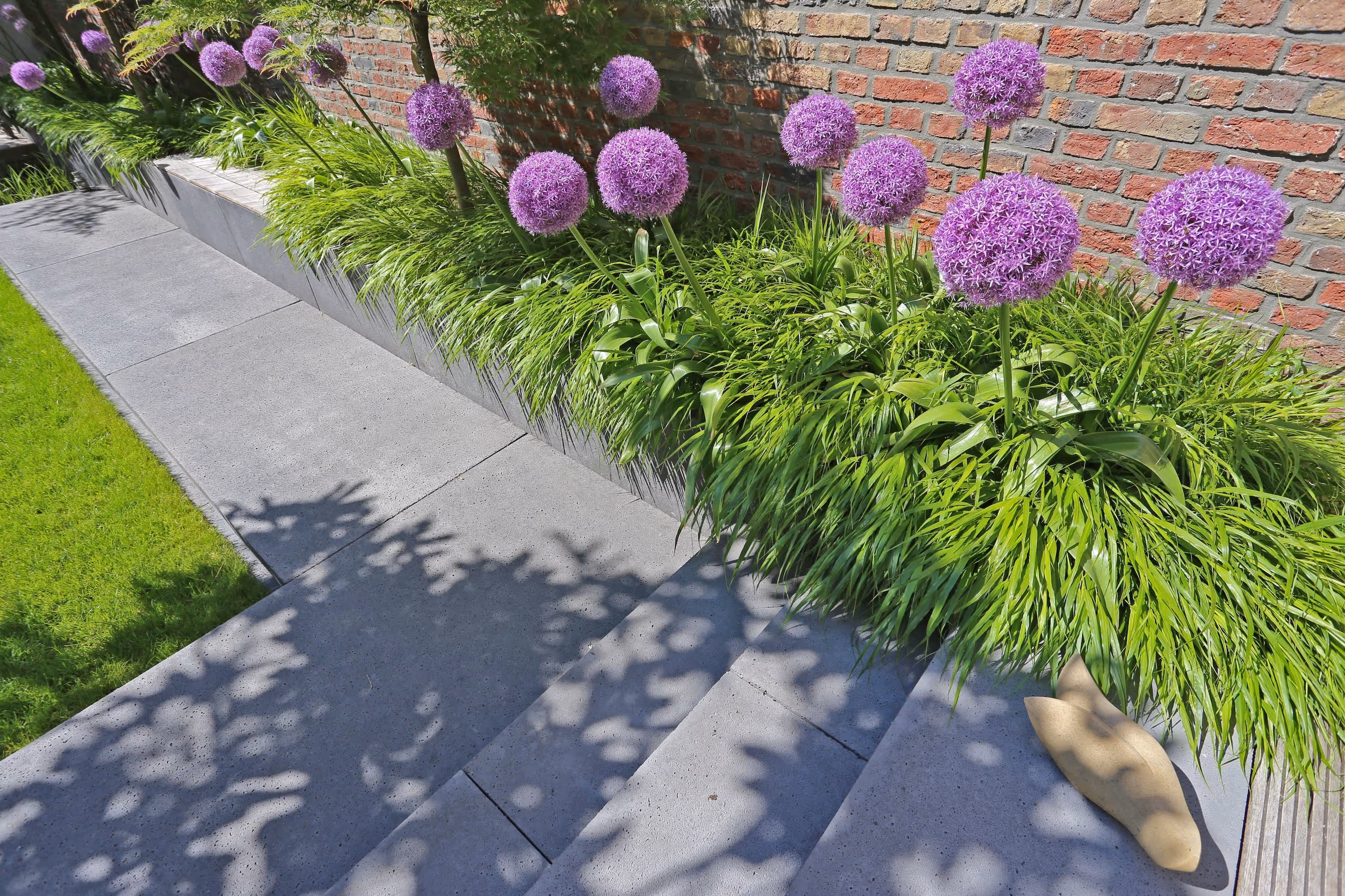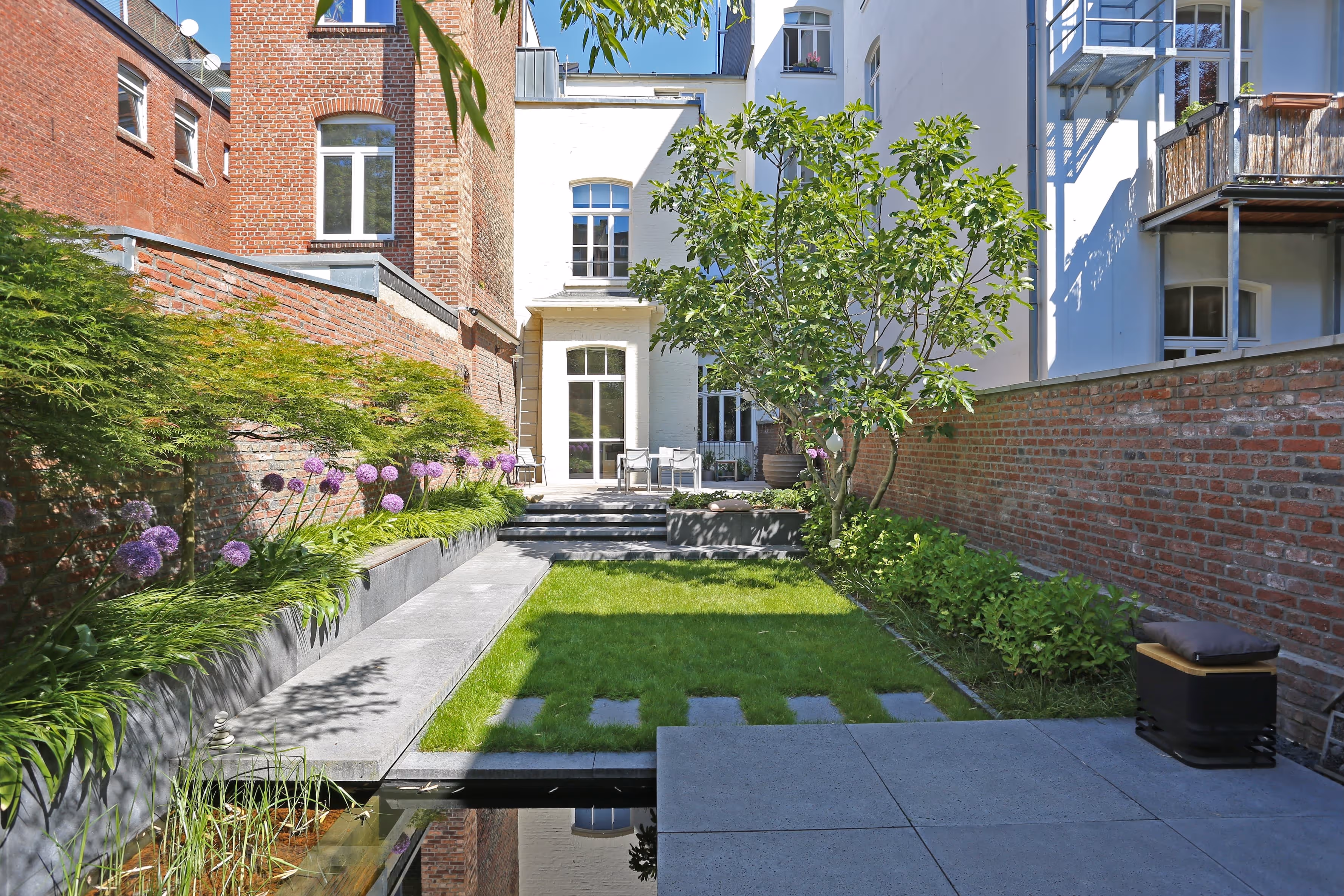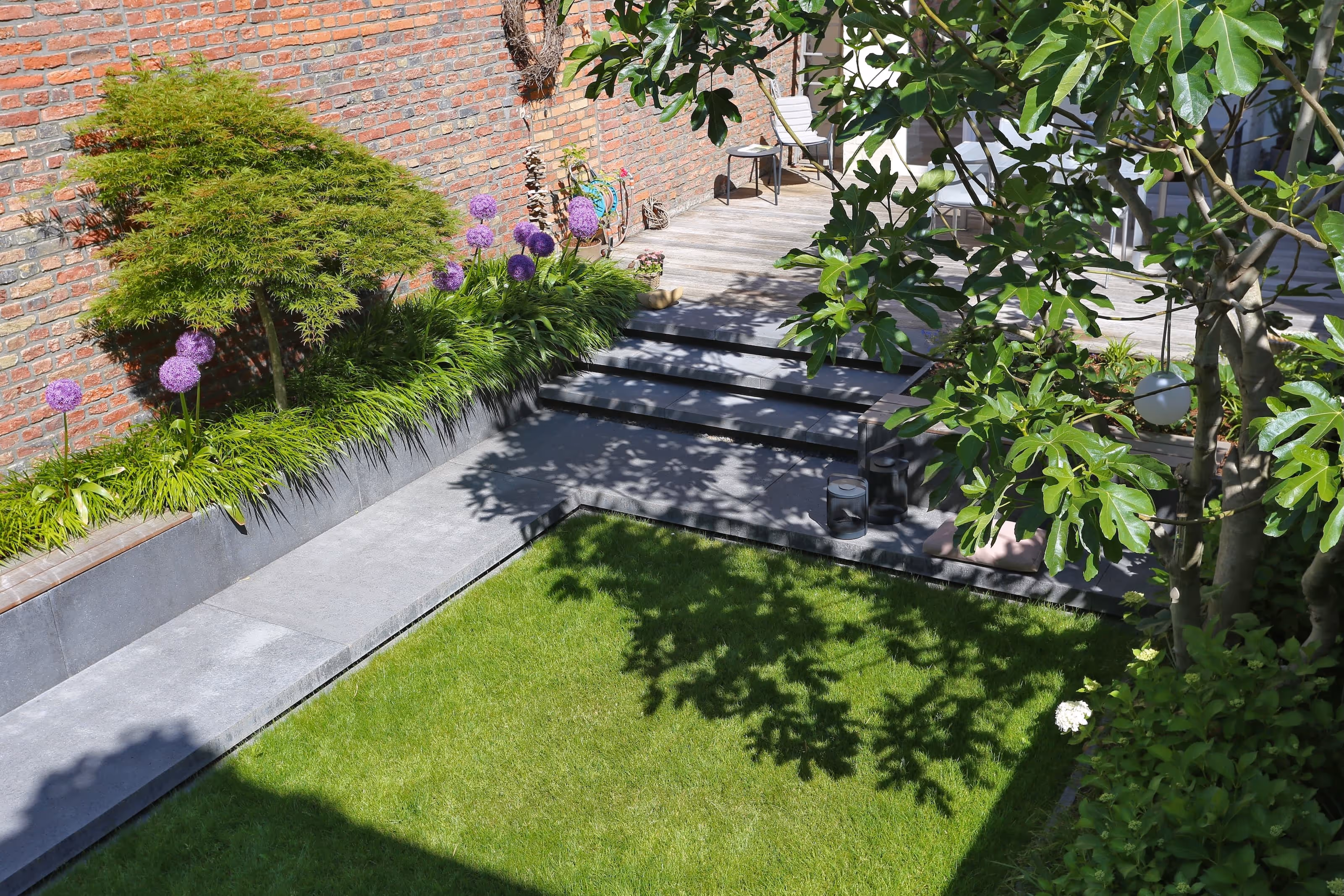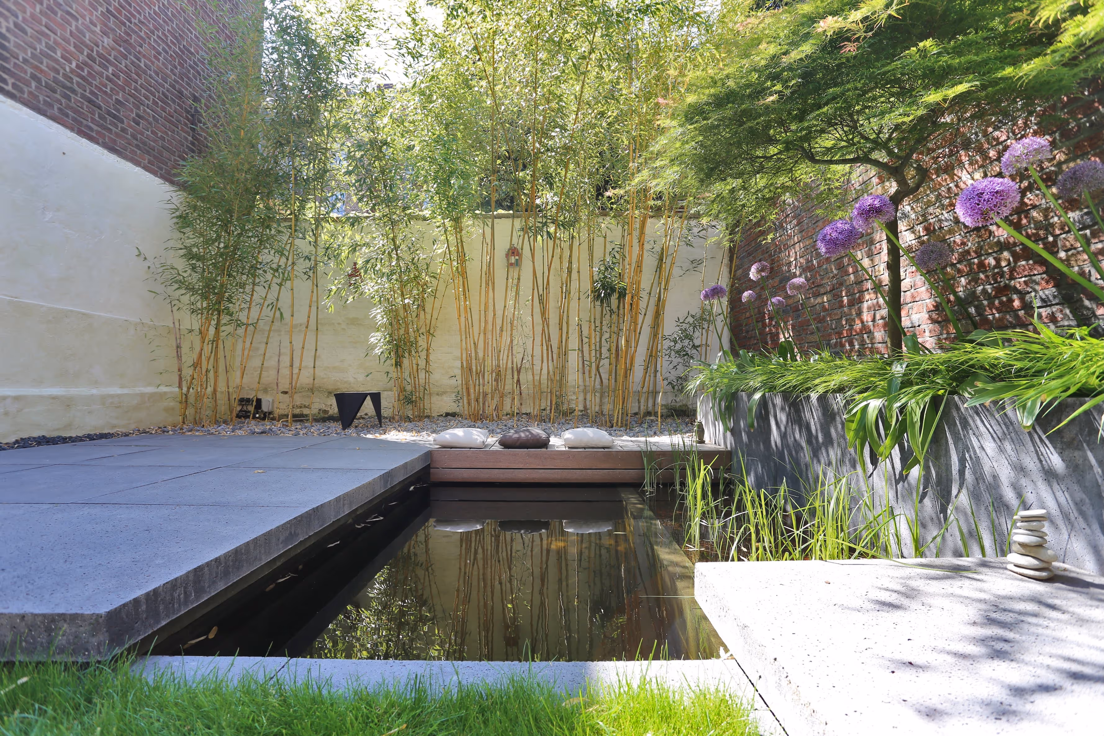 Durch die breiten schwebenden Treppenstufen wird man sozusagen in den unteren Gartenteil "gezogen". Die in den Aufkantungen integrierten Sitzbänke aus Holz laden ein zum Verweilen. Der hintere Sitzplatz am Wasser mit den grossen Phyllostachys im Rücken, hat fast schon einen meditativen Charakter und bietet gleichzeitig einen Blick mit Abstand zum Wohnhaus (Rückblick). Man hat das Gefühl in einer kleinen grünen Oase zu sitzen, mit summenden Bienen in den Ohren und dicken reifen Feigen über dem Kopf. Ein kleiner Urlaubsort an dem man vergisst, dass man sich mitten in der Stadt befindet.